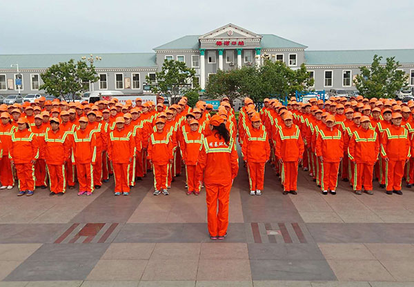 機(jī)洗(洗掃車洗掃吸一體)→機(jī)保(保潔車巡回保潔)→人沖(手持槍沖洗人行道)→人工(人工清掃保潔) -